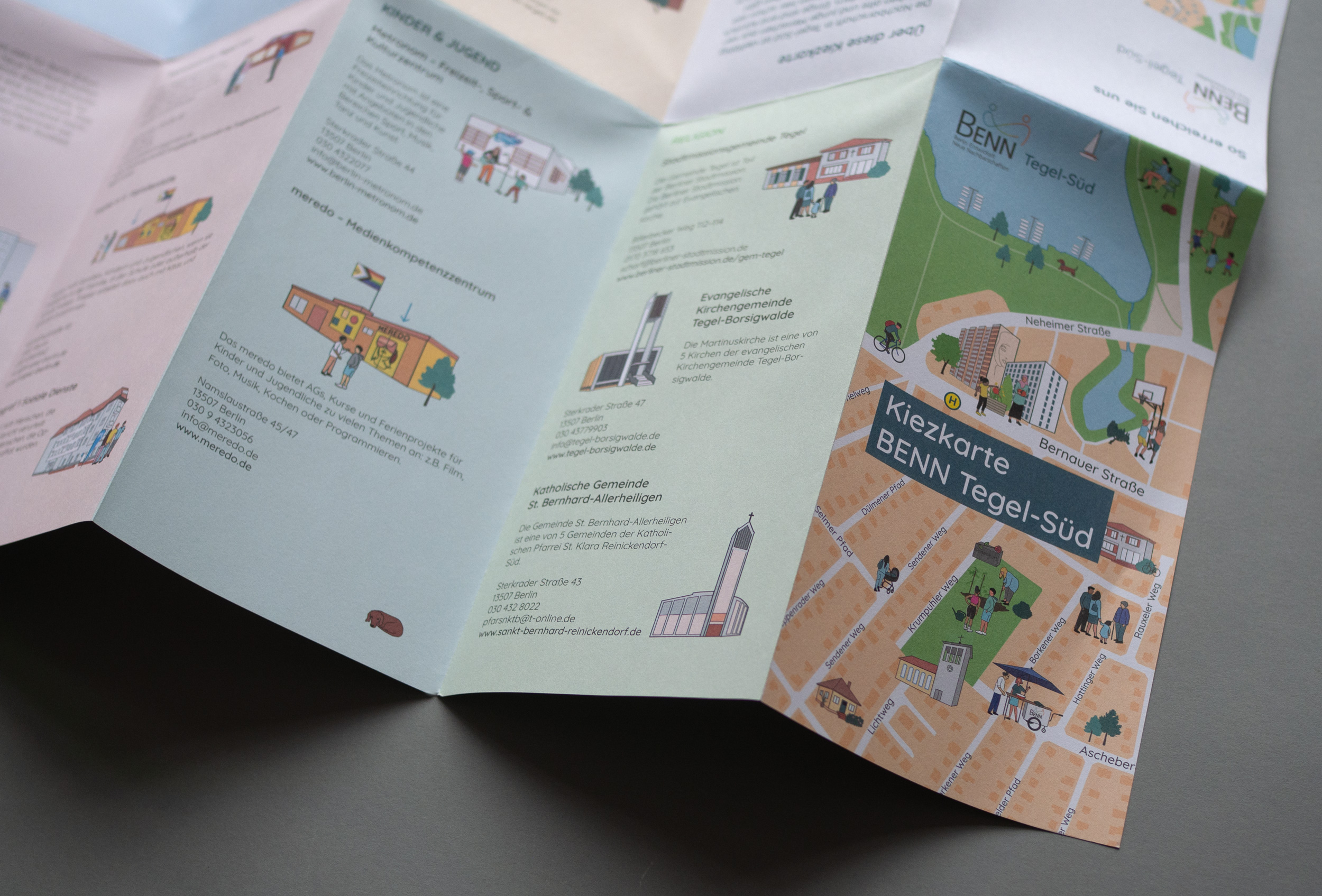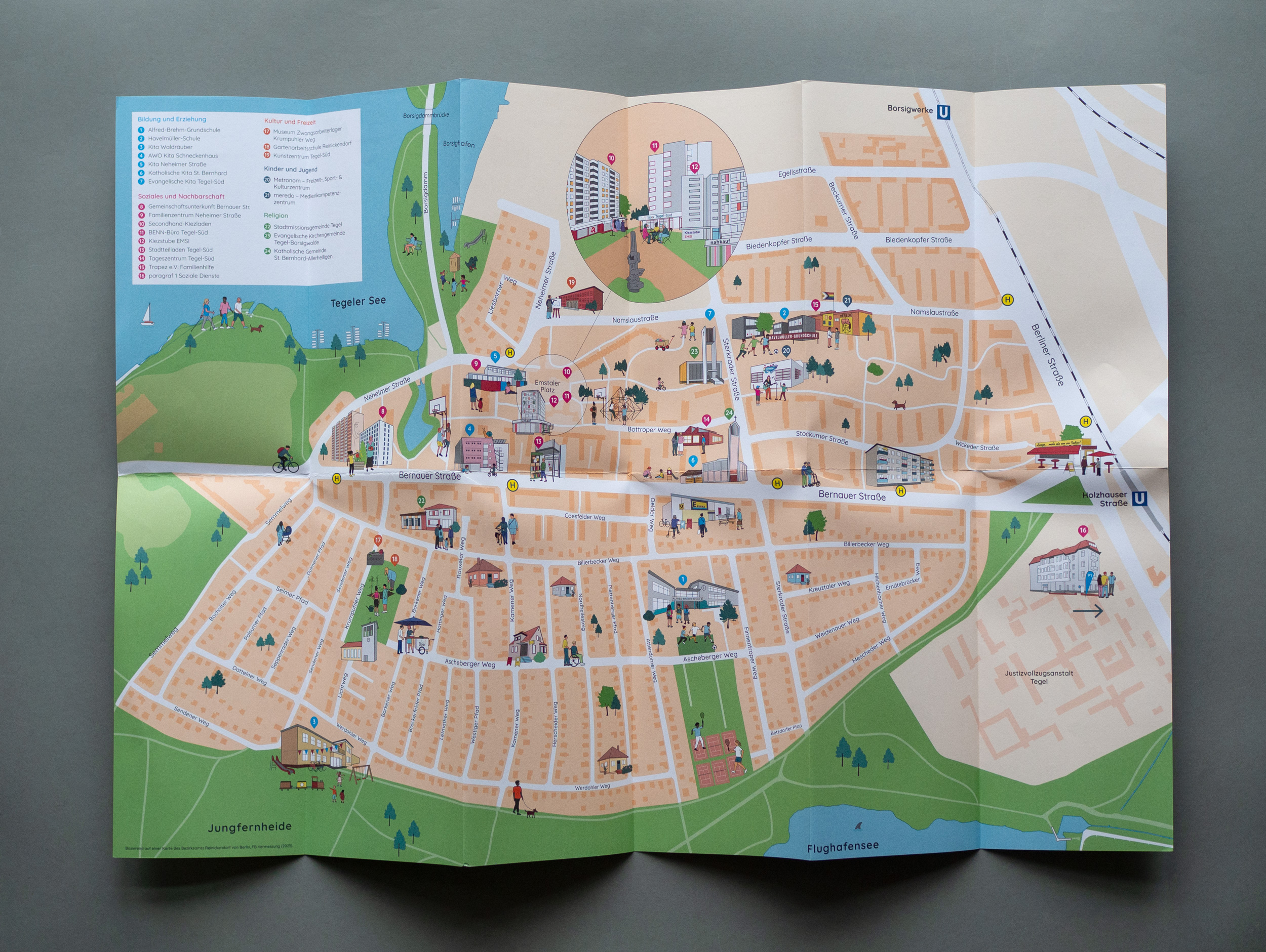 2025 habe ich eine Stadtteilkarte für Tegel-Süd in Berlin-Reinickendorf gestaltet und illustriert. Die Herausforderung lag daran, Gebäude / soziale Einrichtungen zu abstrahieren und trotzdem wiedererkennbar zu zeichnen. Neben einem Faltplan sind auch zwei Pläne im öffentlichem Raum entstanden. Die Pläne unterstützen die Nachbarschaft bei der Orientierung und Information.