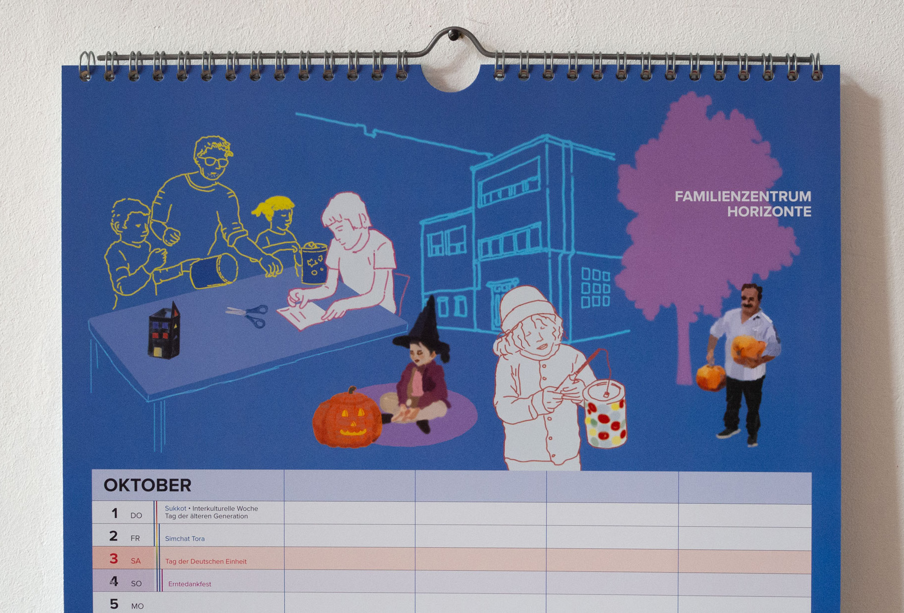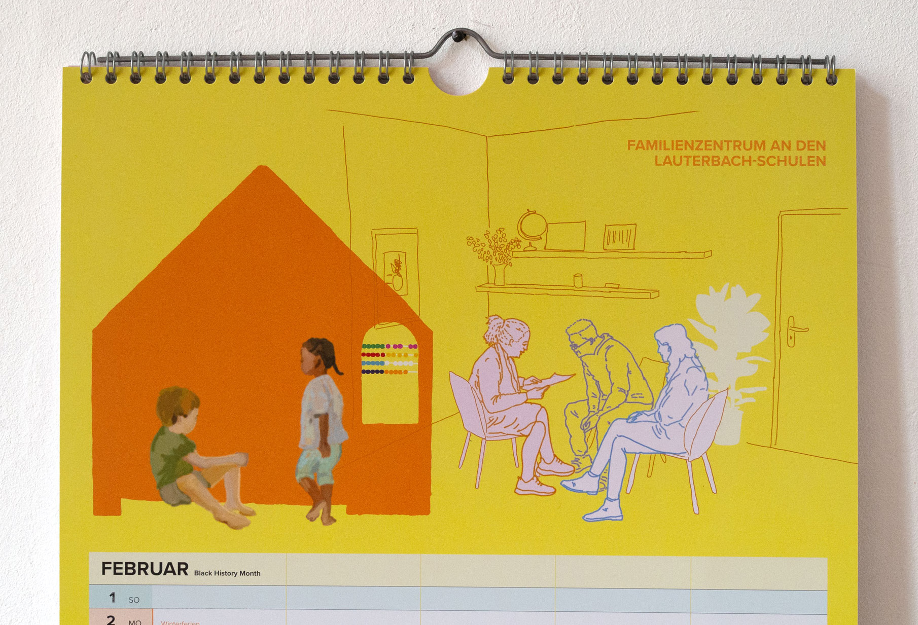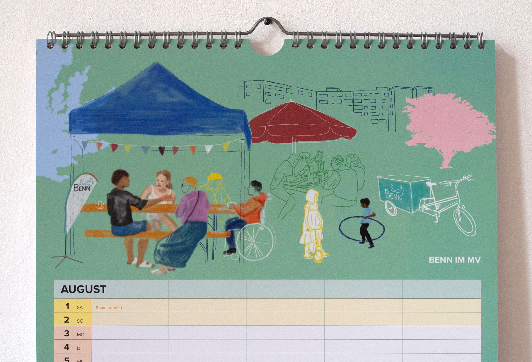 2025 habe ich gemeinsam mit Giulia Palombino den MV Wandkalender 2026 illustriert: 12 farbenfrohe Motive plus Cover. Konzept und Komposition der Motive waren unser Teamwork. Der Illustrationsstil und eine Mehrzahl der Figuren stammen aus Giulias Feder. In dem Kalender stellen das BENN Team im Märkischen Viertel und die GESOBAU zwölf besondere Orte der Begegnung und Gemeinschaft vor, die den Zusammenhalt und die gegenseitige Unterstützung in der Nachbarschaft des Märkischen Viertels fördern.